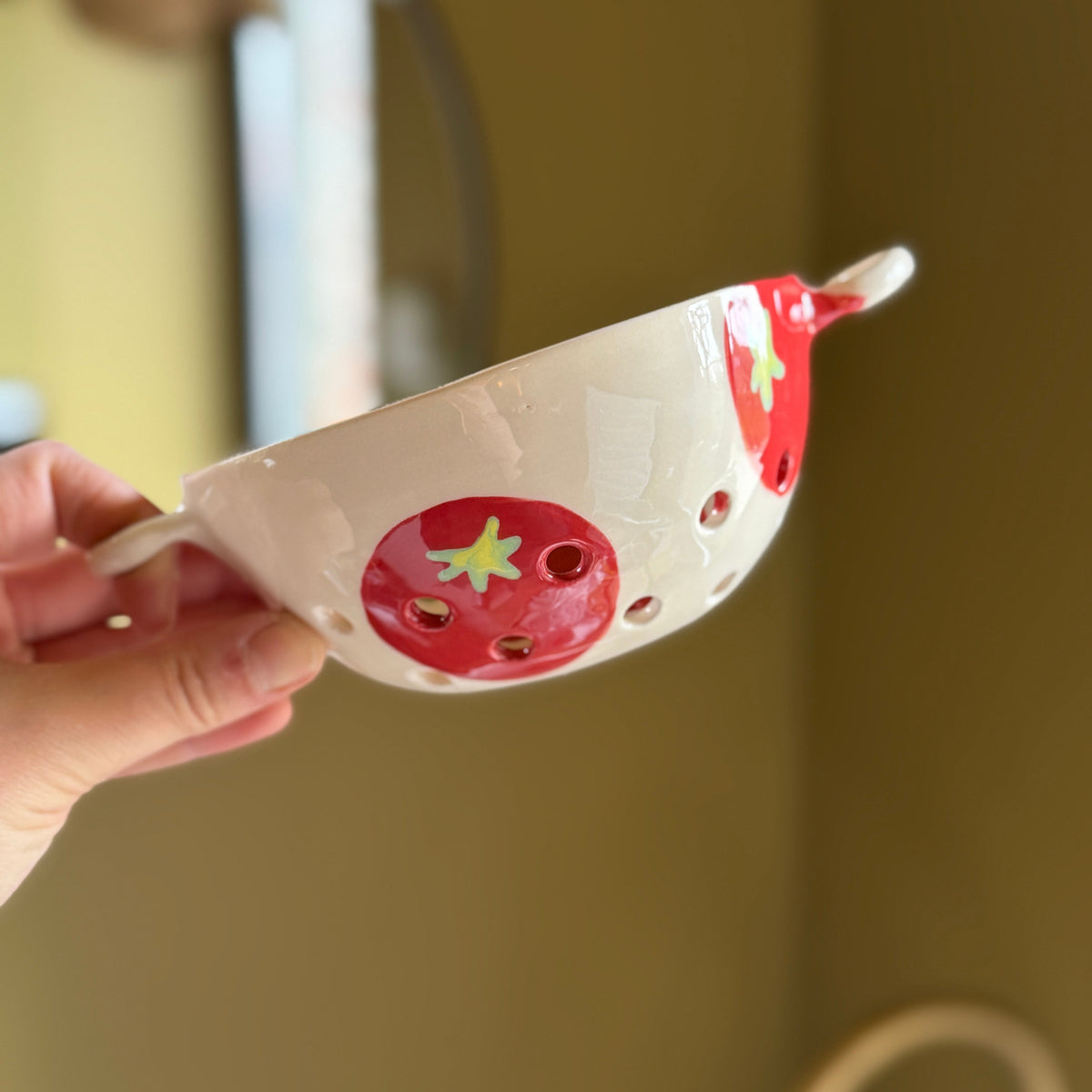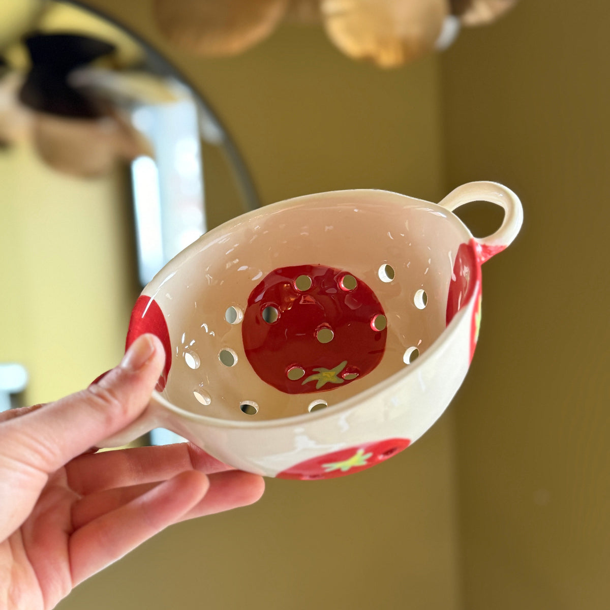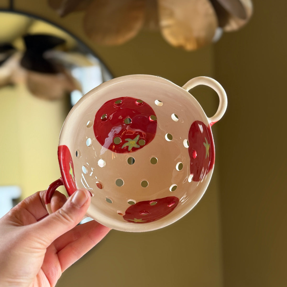 Une jolie passoire en faïence décorée à la main.